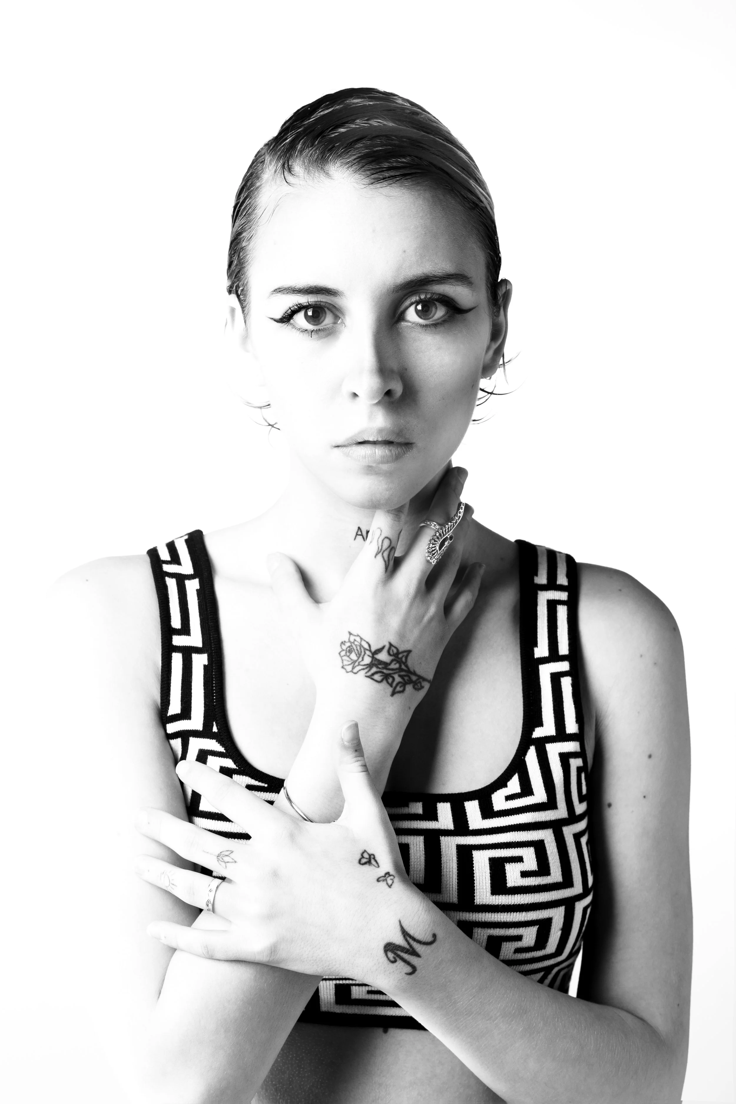 Une femme assise contre un mur, portant un haut blanc à bretelles, un jean blanc, et des chaussures blanches, sous un éclairage naturel avec des ombres recreusées par la lumière.