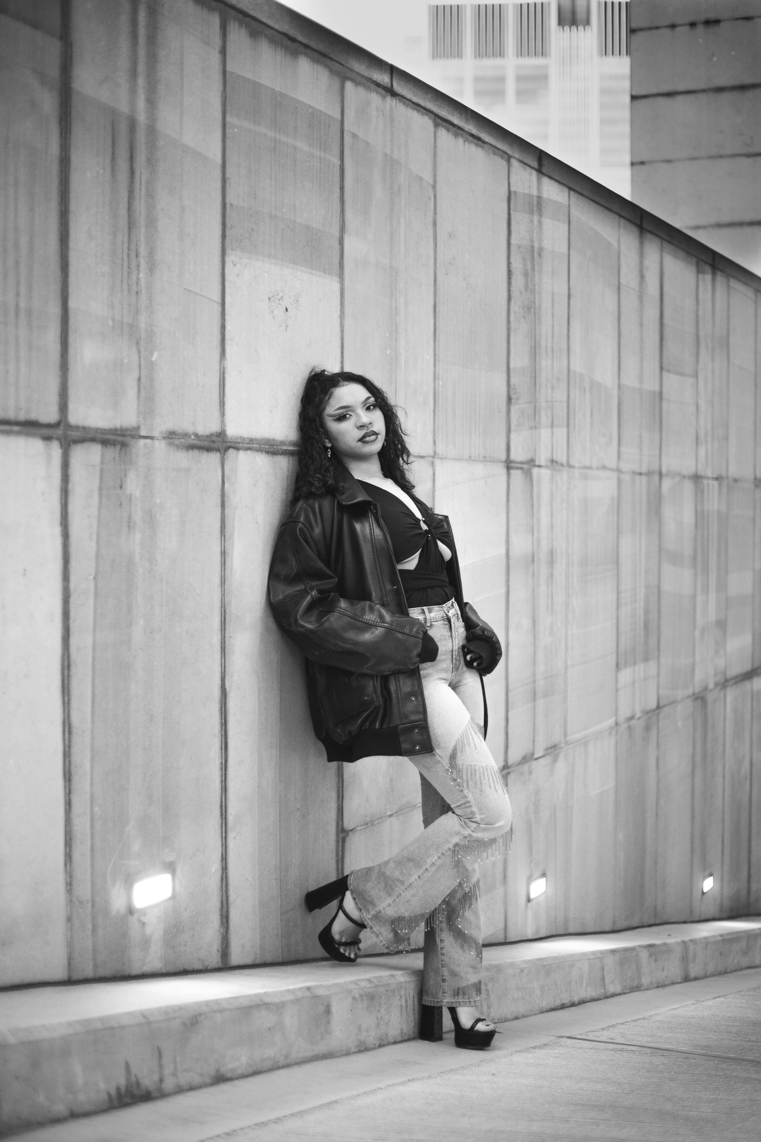 Femme posant contre un mur en pierre, portant une veste en cuir, un haut noir et un pantalon pailleté, avec des chaussures à talons haut, dans une ambiance urbaine en noir et blanc.