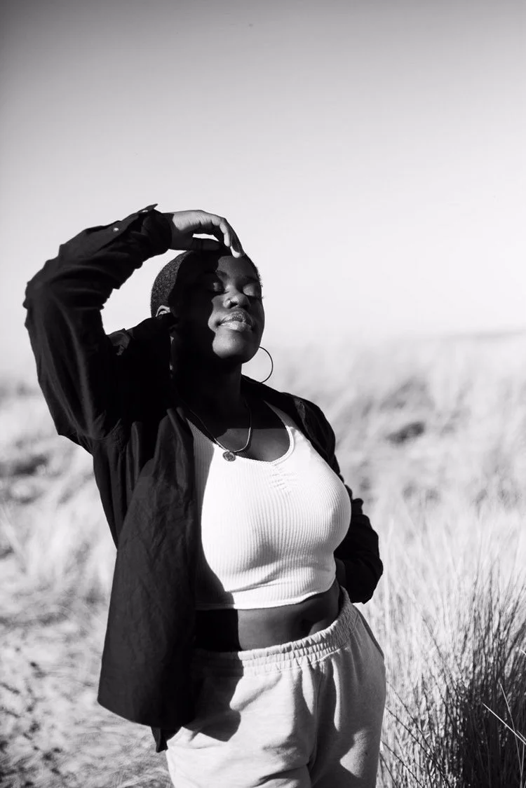 Une femme noire en vêtements décontractés, assise dans un environnement naturel avec de hautes herbes, photographie en noir et blanc.