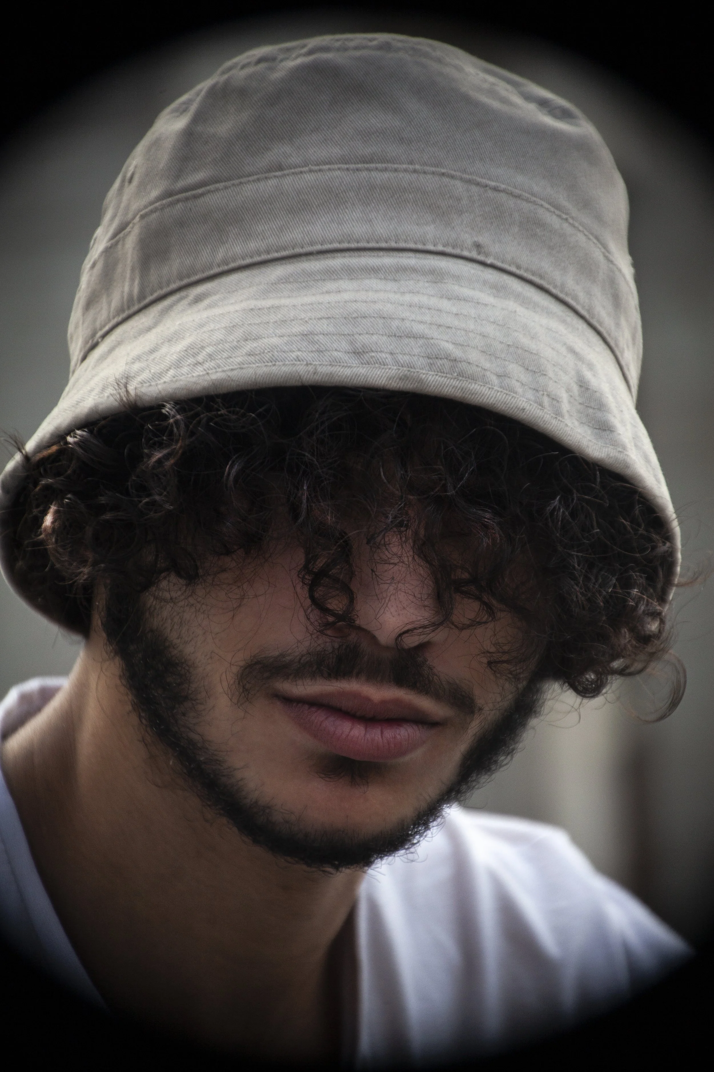 Jeune homme portant un chapeau gris, avec des cheveux bouclés, souriant légèrement.