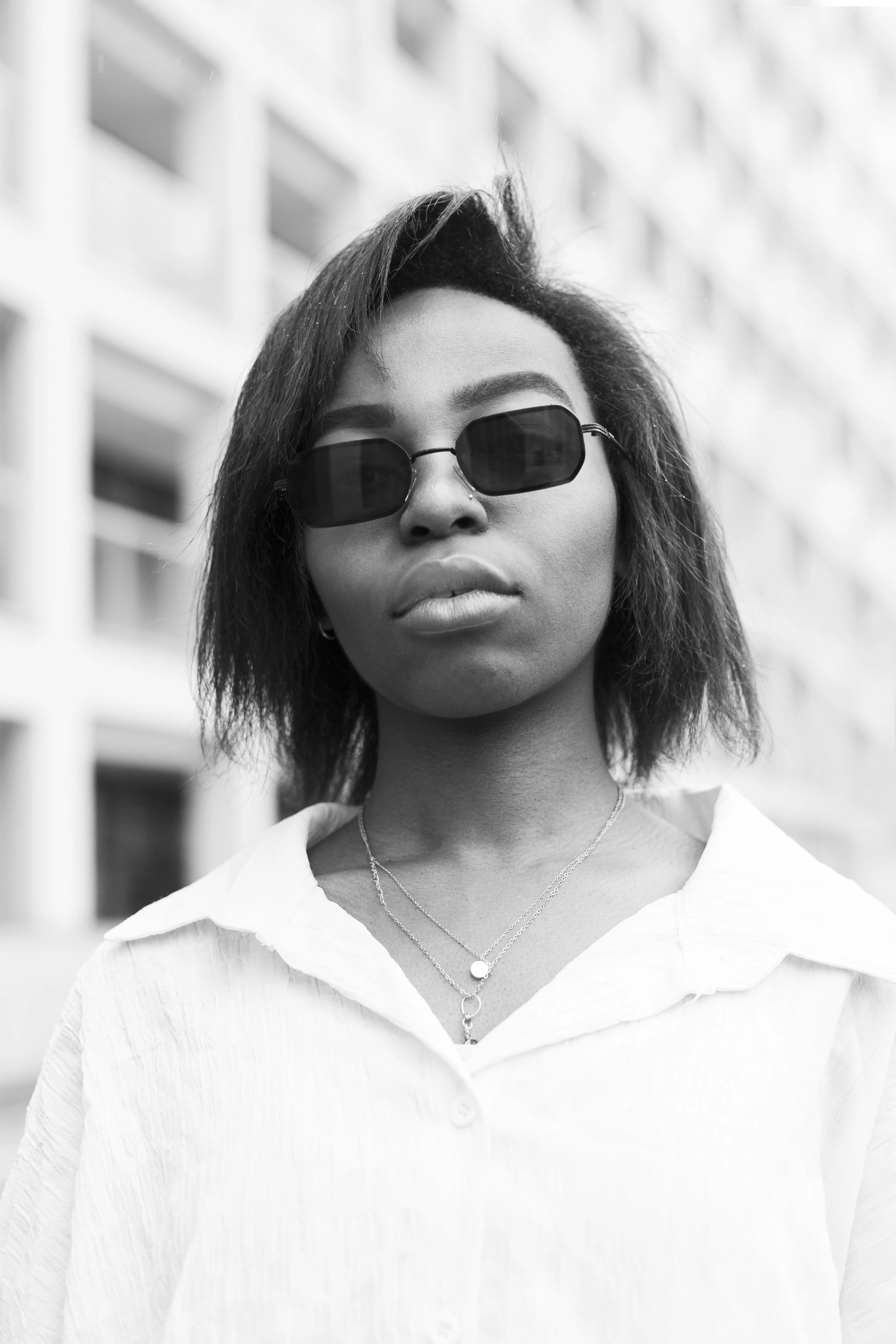 Portrait noir et blanc d'une femme portant des lunettes de soleil, avec des cheveux en désordre, regarde vers la droite, contre un fond flou d'un bâtiment.