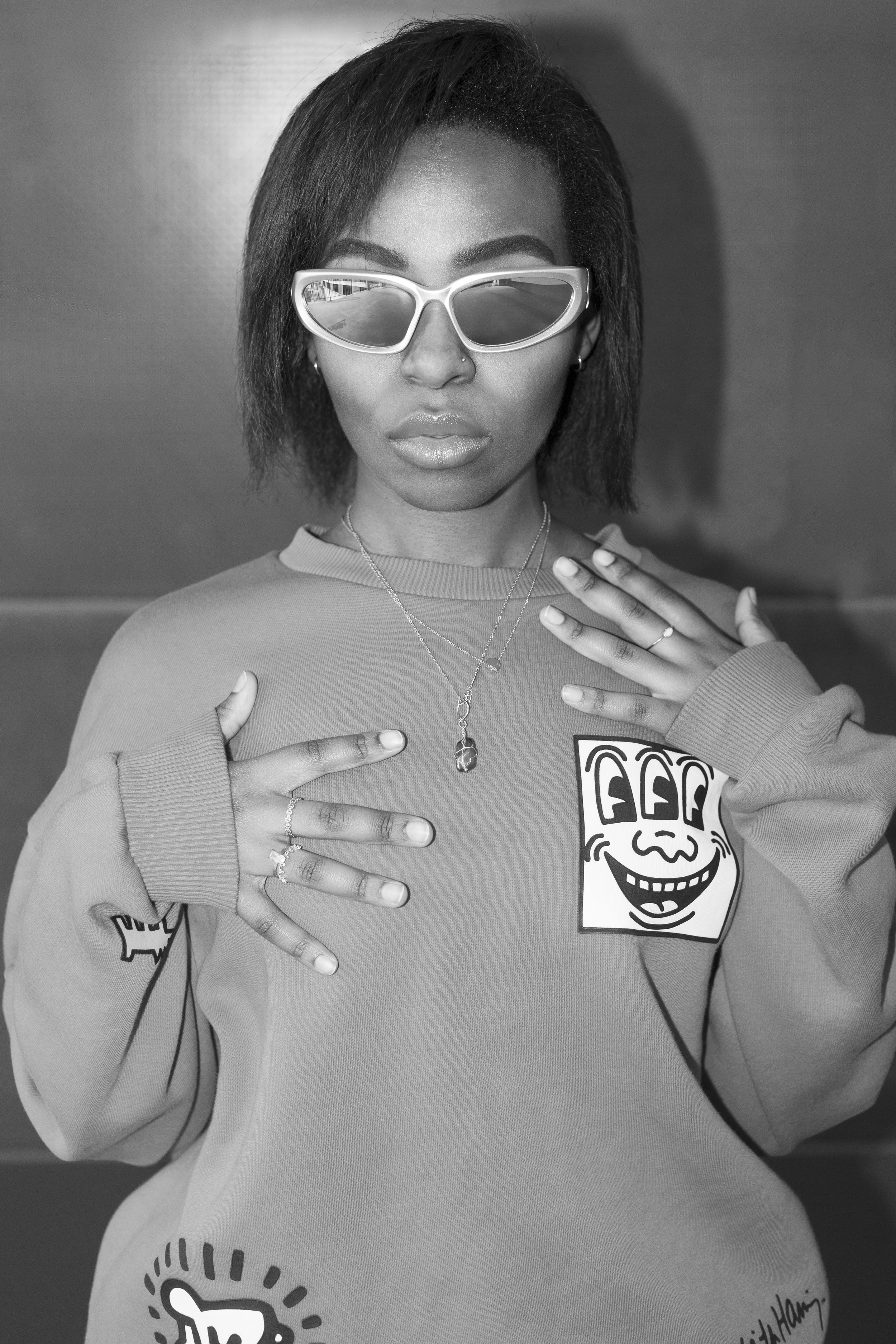 Une femme portant des lunettes de soleil, des bijoux et un sweat-shirt avec un visage souriant sur la poitrine, pose avec ses mains sur sa poitrine. L'image est en noir et blanc.