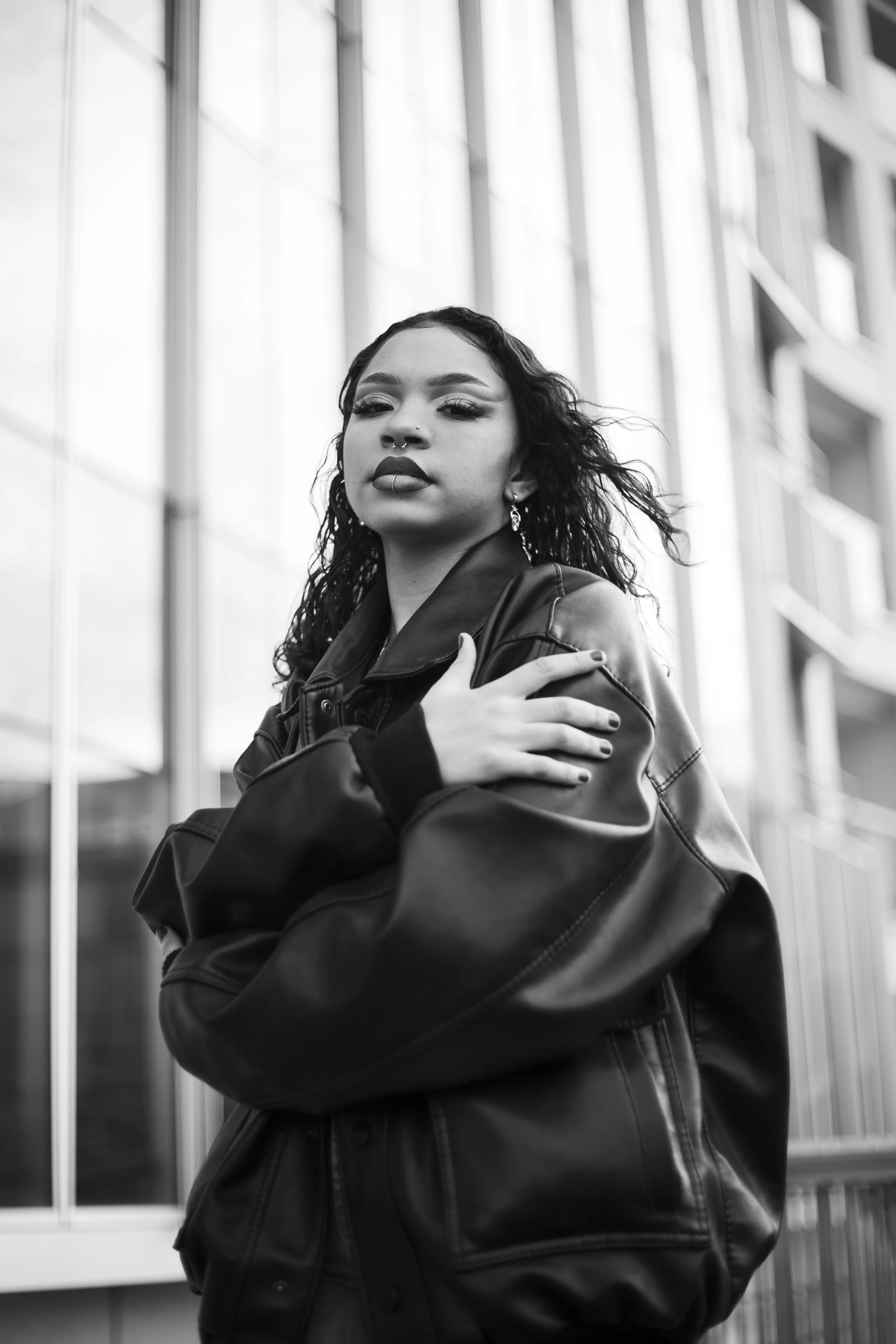 Portrait en noir et blanc d'une jeune femme avec des cheveux bouclés, portant une veste en cuir, dans un environnement urbain moderne.
