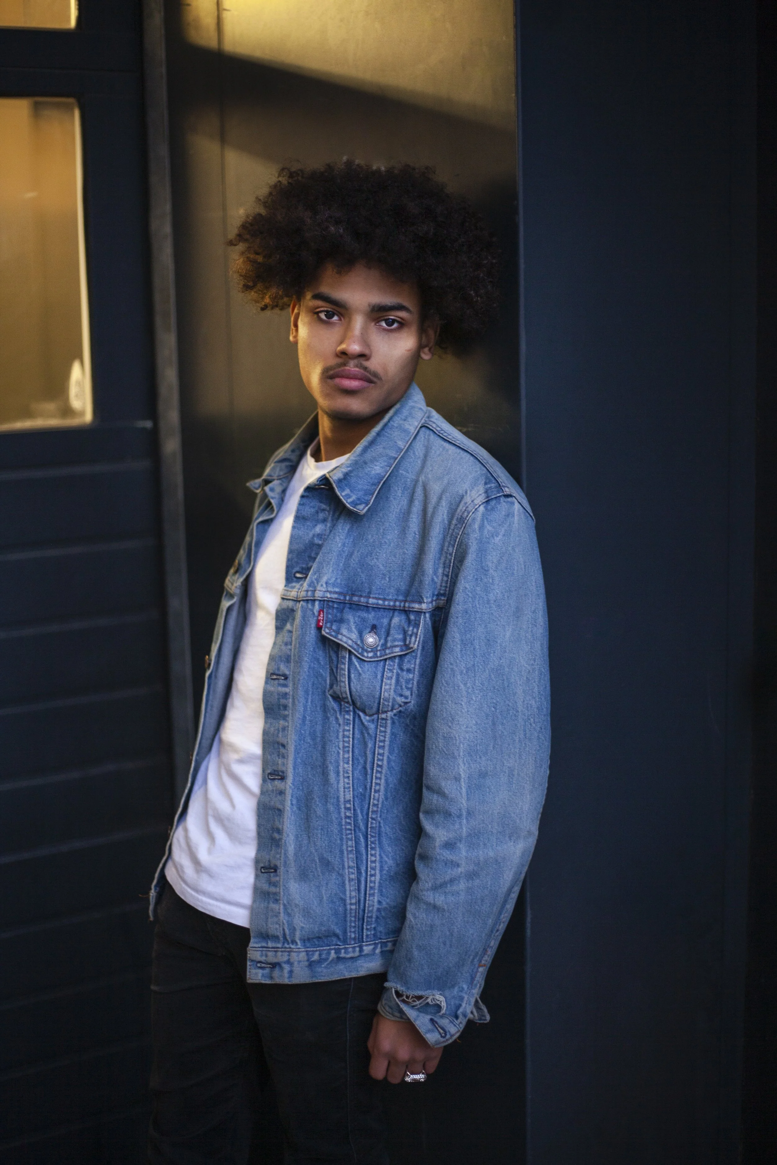 Jeune homme avec une coiffure bouclée, portant une veste en jean et un t-shirt blanc, assis devant une fenêtre dans un environnement urbain.